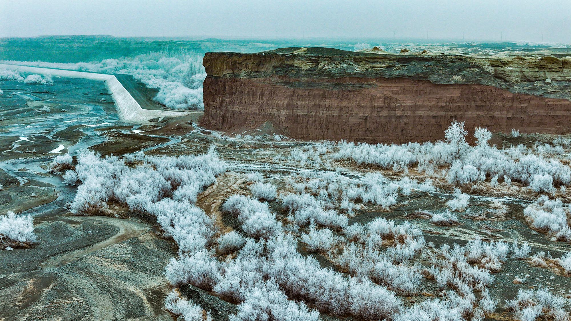 11 января в туристической зоне Тяньшаньской Красной речной долины в уезде Токсон города Турфан Синьцзян-Уйгурского автономного района появилось редкое для зимы явление — живописный иней. Обычно яркие красные и черные скалы покрылись слоем сверкающих белых кристаллов льда, превратив пейзаж в картину, написанную тушью.