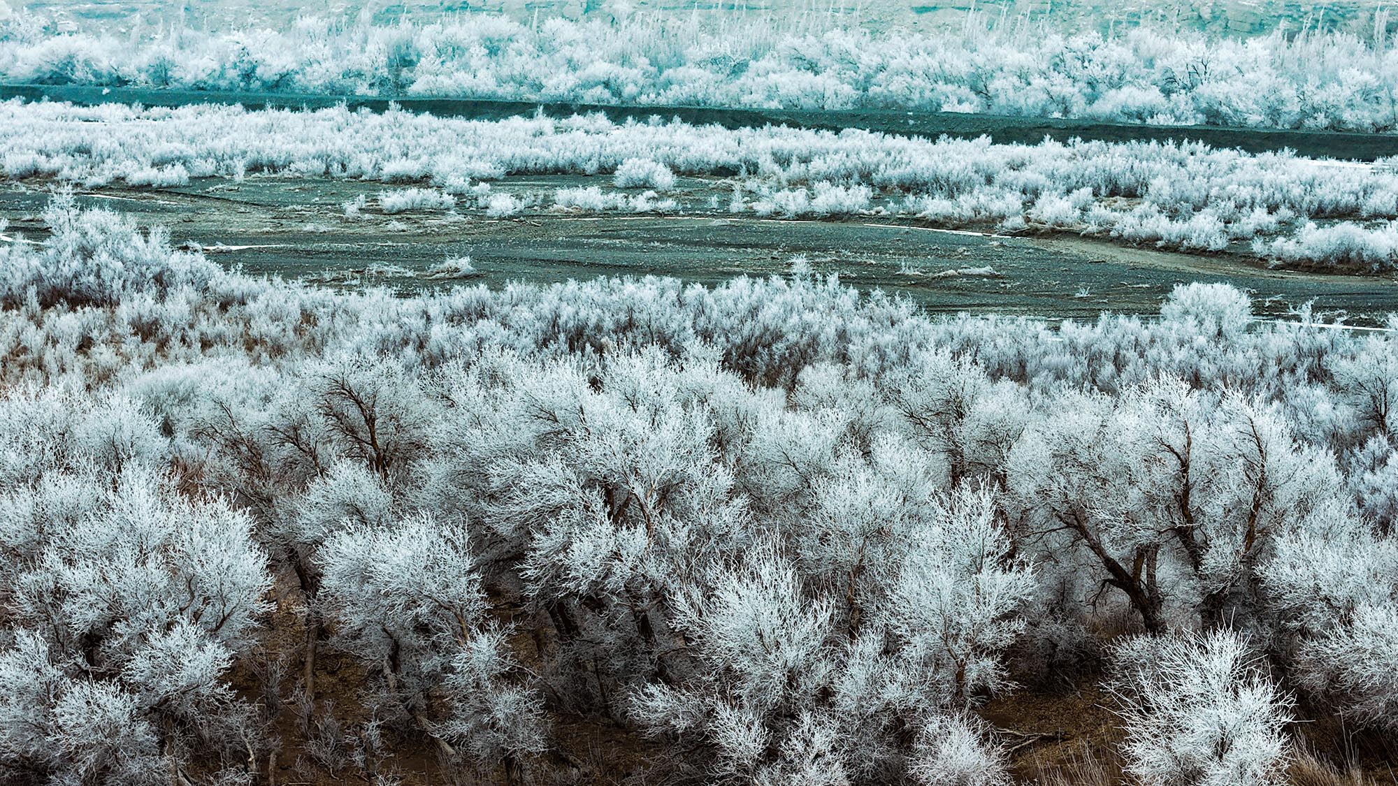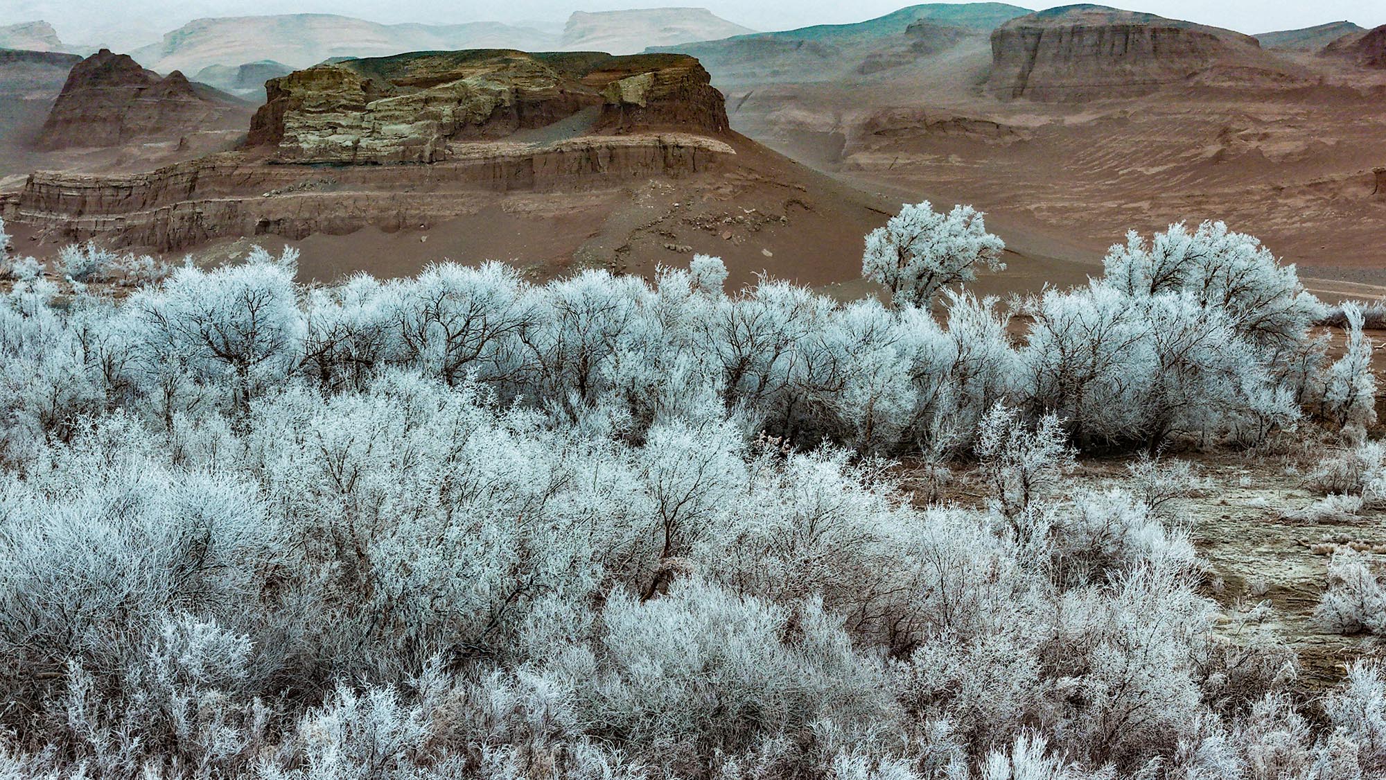Из-за низких температур и высокой влажности в долине образовались обширные поля инея: тополя-туранги, тамариски и другие деревья оказались в серебряном убранстве. Прозрачные ледяные кристаллы контрастируют с древними красно-черными скальными стенами по берегам. На дне ущелья среди покрытых морозом деревьев продолжает течь река Байян.